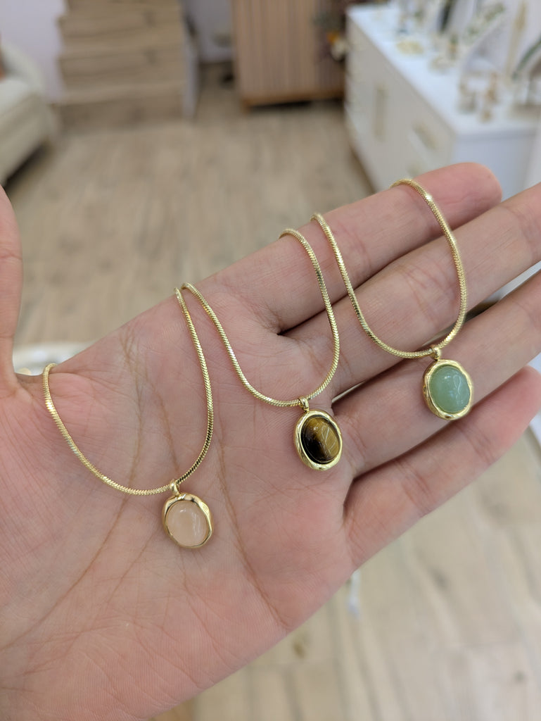 Découvrez notre collection de colliers en acier inoxydable, résistants à l’eau et pensés pour durer. Chaque modèle est orné d’une pierre naturelle mise en valeur par un contour doré élégant, suspendu à une chaîne fine de 41 cm + 5 cm d’extension pour un ajustement parfait.